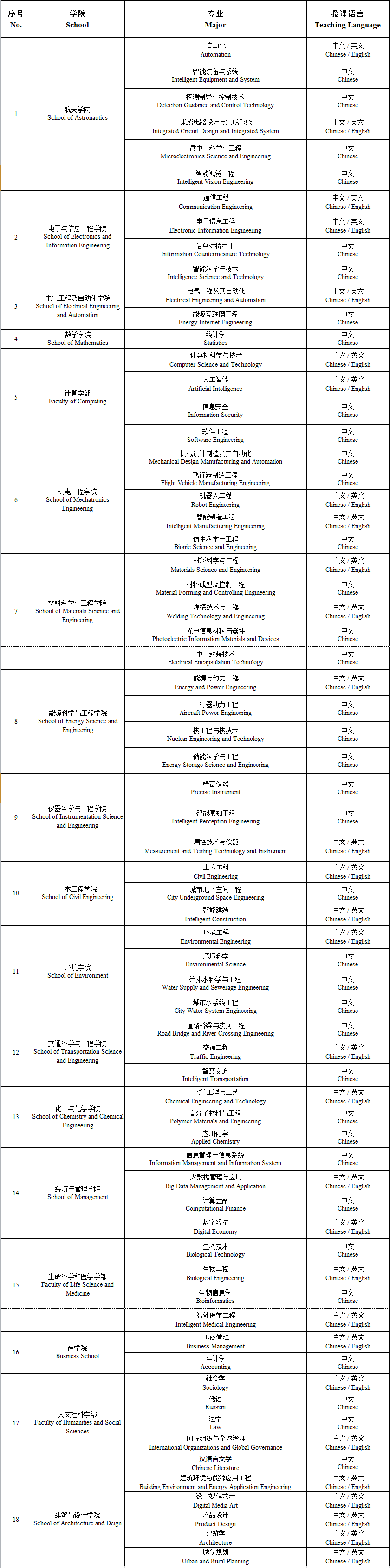 입학조건 | - 고졸 이상 - 만 18세 ~ 만 30세(장학생 신청자 만 25세까지) - HSK 4급 210점 - CSCA 성적보유자 - IELTS 6.0(각 과목 5.5 이상) 혹은 TOEFL 80점 이상(영어로 수업하는 과정) | ||||||||||||||